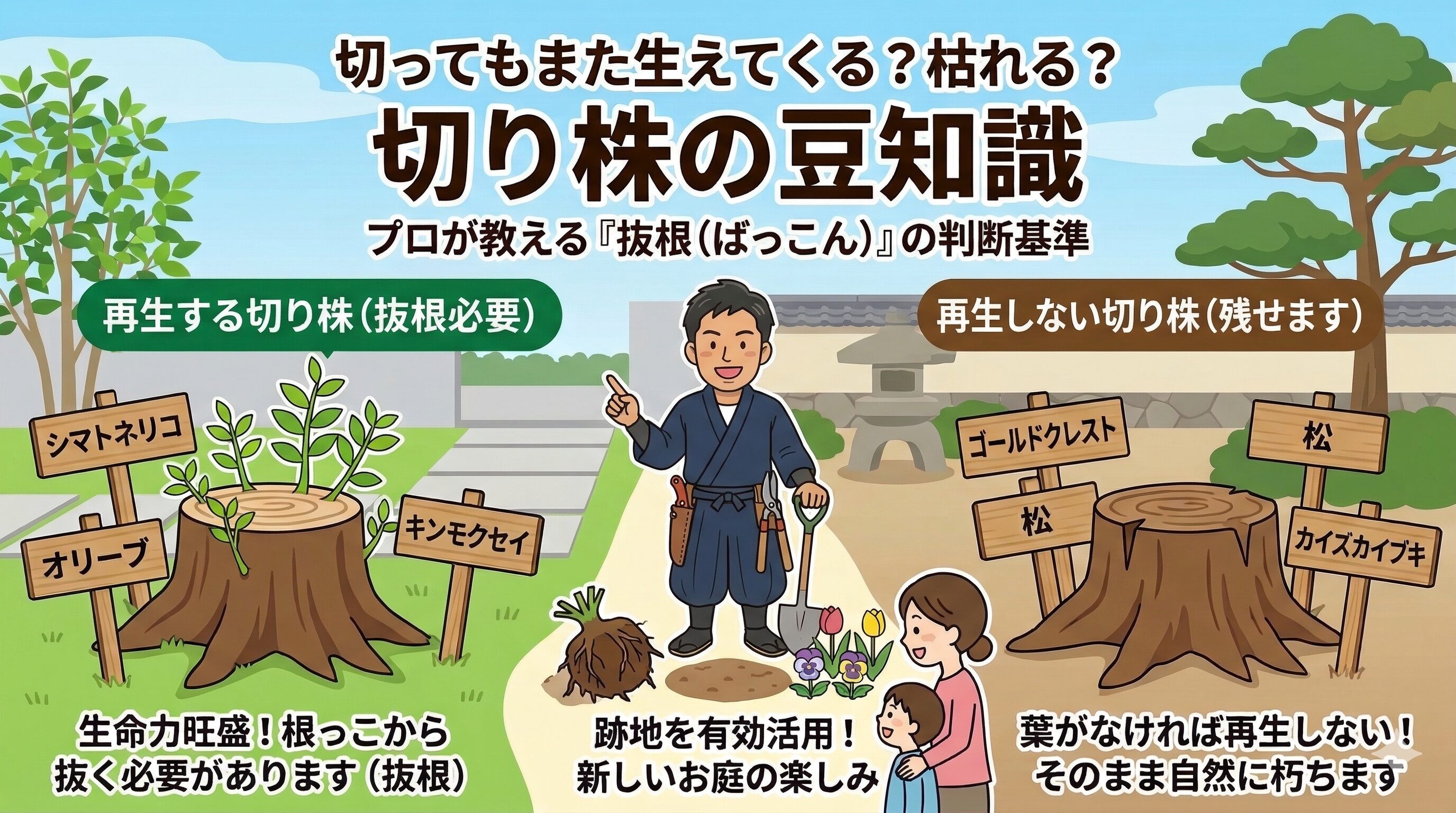 今回は、お庭の豆知識として「抜根(ばっこん:根から抜くこと)が必要な木・不要な木」の見分け方と、プロがおすすめするお庭の有効活用法についてお話しします。